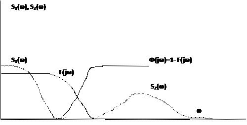 Какой же должна быть амплитудно-частотная характеристика оптимального линейного фильтра, чтобы дисперсия суммарной ошибки в результате комплексной обработки информации была существенно меньше, чем ошибки отдельных измерителей. Чтобы ответить на этот вопрос рассмотрим идеальный случай, когда спектральные плотности не пересекаются S1(w), S2(w). Тогда, поскольку дисперсия ошибки N1(t) сосредоточена в области нижних частот, а дисперсия ошибки N2(t) сосредоточена в области высоких частот, следовательно, логично в качестве оптимального фильтра F рассматривать - некоторый фильтр нижних частот, амплитудно-частотная характеристика F(jw) которого имеет вид, изображенный на рисунке. Тогда фильтр Ф, амплитудно частотная характеристика которого Ф(jw)= 1-F(jw) будет фильтром верхних частот.
