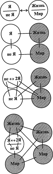По мере развития мышления и чувств, через переживание их несоответствия как несоответствия себя самого самому же себе, ребенок получает психологические материалы (через эмо- циональные состояния), которые позволяют ему дифференци- ровать существование во внешней реальности живого и нежи- вого (в том числе идей жизни и свойств мира). В себе самом обнаруживается собственное Я и его несоответствие не-Я, то есть другому Я, принадлежащему кому-то персонально или людям вообще.