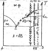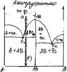При конгруэнтном плавлении образуется ж.ф. такого же состава, как и исходный. При инконгруэнтном – при плавлении разлагается, образуется ж.ф. и образуется другое соединение, отличное от состава исходного. Признак соединения плавящегося конгруэнтно: вертикаль состава tAB – AB доходит до кривой ликвидуса, которая образует здесь максимум. Определение конечных фаз и конечной точки кристаллизации: конечными фазами кристаллизации будут те кристаллические фазы между точками состава которых попадает вертикаль исходного состава. Эвтектика – тройная инвариантная точка – состав, кристаллизация которого заканчивается или плавление начинается при строго постоянной и наинисшей температуре, а составы соответствующие этим точкам называют эвтектическими.