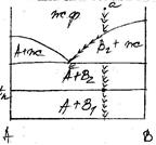 А и В образуют соединение АВ, которое плавится с разложением. Признак: вертикаль состава не доходит до кривой ликвидуса, а ограничена горизонталью температур – перитектической температурой, причем на кривой ликвидуса появляется точка перитектики. Перитектика отличается от эвтектики: · в эвтектике идет физический процесс кристаллизации двух фаз, а точка перитектики – это точка химической реакции, т.е. кристаллизация идет с химическим взаимодействием компонентов. В перитектике при охлаждении ранее выпавшая кристаллическая фаза взаимодействует с ж.ф. состава этой точки и полностью или частично исчезает, а другая фаза кристаллизуется. · в эвтектике кристаллизация всегда заканчивается, т.е. исчезает ж.ф., а в перитектике кристаллизация может закончиться, а может и продолжиться и закончиться в эвтектике. Для этого нужно определить конечные фазы и конечную точку кристаллизации.