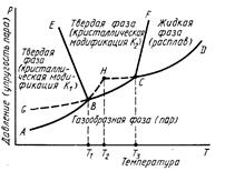 В полях система дивариантна, в равновесии одна фаза, т.е. можно изменять два параметра. На кривых упругости пара система моновариантна, в равновесии две вазы. В точках В и С система инвариантна, в равновесии три фазы. Полиморфизм – способность соединения одного и того же химического состава существовать в различных структурах. Полиморфные превращения: энантиотропные (обратимые) и монотропные (необратимые).