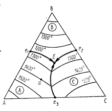 2) Диаграмма состояния трехкомпонентной системы с эвтектикой. Эвтектический состав и эвтектическая температура, пограничные кривые. Правила определения характера пограничных кривых, состава первичной выпадающей при кристаллизации фазы, температуры начала кристаллизации, начального пути изменения состава жидкой фазы при кристаллизации. Применение правила рычага в этой системе.