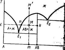 Для двух компонентных систем применение правила рычага сводится к рассмотрению соответствующих коннод, концы которых показывают точки составов фаз, находящихся в равновесии, причем сама коннода вертикалью исходного состава делится на два отрезка, длины которых (в обратной пропорциональности) характеризуют количества равновесных фаз. Предположим, что исходный расплав состава М' (рис. 75) охлажден до температуры t. При этой температуре в равновесии находятся жидкая фаза, состав которой выражается точкой п, и твердая фаза (кристаллы соединения АВ), состав которой выражается точкой k, лежащей на вертикали состава соединения АВ. Исходный состав можно выразить точкой М лежащей на пересечении конноды nk с вертикалью исходного состава М'т (составы М' и М одинаковы). По правилу рычага содержание при температуре t жидкой фазы (точка п) я кристаллической фязы АВ (точка k) определится из выражении. Содержание жидкой фазы