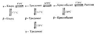 Как видно из представленной схемы, все указанные на ней превращения являются энантиотропными. Превращения в пределах каждой главной формы, т. е. β -кварц↔ α -кварц, γ -тридимит↔ β -тридимит↔ α -тридимит и β -кристобалит↔ α -кристобалит (превращения в вертикальных рядах на схеме), относятся к полиморфным переходам со смещением во вторичной координационной сфере и происходят очень быстро. Это объясняется незначительными структурными изменениями при этих переходах ввиду сходства структур модификаций второго порядка (структуры модификаций второго порядка представляют собой несколько искаженные производные структур основных форм SiO2). В противоположность этому превращения между главными модификациями, т. е. а-кварц↔ α -тридимит↔ α -кристобалит (превращения в горизонтальном ряду на схеме) относятся к реконструктивным превращениям во вторичной координационной сфере и протекают при изменении температуры очень медленно, поскольку они связаны со значительной перестройкой структуры (превращения между главными модификациями значительно ускоряются в присутствии добавок— минерализаторов, например CaO, FeO и т. д.). Весьма важным для практики, например при производстве динасовых огнеупоров, являются изменения плотности и объема при полиморфных превращениях SiO2. При переходе от низкотемпературных форм SiO2 к высокотемпературным плотность уменьшается, а удельный объем увеличивается. Наиболее плотная из представленных на диаграмме Феннера форм SiO2 β -кварц (плотность 2, 65-103 кг/м3), наименее плотная — кристобалит (2, 32-103 кг/м3). Объемные изменения при фазовых переходах в системе SiO2 (расширение при нагревании, сжатие при охлаждении) могут достигать весьма значительных величин (до 15%) и служить причиной разрушения изделий на основе SiO2 (например, динасового кирпича).