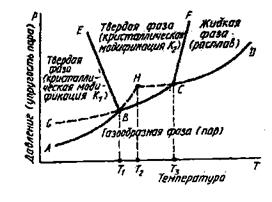 ОдноКомпонентные диаграммы состояния строятся в координатах температура (ось абсцисс) - давление газообразной фазы или упругость паров над кристаллической или жидкой фазами (ось ординат). (Иногда на оси ординат в виде произвольной шкалы откладывается энергия Гиббса). Поскольку в данном случае давление принимается за переменный параметр системы, правило фаз используется для характеристики равновесных состояний однокомпонентных систем в виде f = К + 2 - Р. Ввиду трудности измерения упругости пара над тугоплавкими силикатными фазами в конденсированном состоянии и ее относительно малой зависимости от температуры, осью ординат часто служит произвольная шкала, т. е. на ней не указываются значения упругости пара, а обозначается только направление повышения этого параметра. Основным элементом строения однокомпонентных диаграмм состояния являются линии упругости пара (линии АВ, ВС, CD BE. CF, рис. 1). которые разделяют все поле диаграммы на области стабильною существования отдельных фаз (обозначения этих фаз указываются в соответствующих областях диаграммы). Ниже кривой ABCD находится область газообразной фазы (пара), область ABE является областью равновесного существования модификации К1, область EBCF - модификации К2 и область FCD - жидкой фазы (расплава). Все эти области однофазны и согласно правилу фаз для однокомпонентных систем дивариантны, т. е. в границах этих областей можно произвольно менять два параметра (температуру и давление), не нарушая равновесие и системе, т. е, пс изменяя число и состав фаз. Вдоль линий упругости пара АВ, ВС, CD, BE и СЕ, разделяющих области существования отдельных фаз, в равновесии находятся соответственно по две фазы: твердая фаза К1 - пар (АВ), твердая фаза К2 - нар (ВС), жидкость - пар (CD), твердая фаза К1 - твердая фаза К2 (BE) и твердая фаза К1, - жидкость (CF). Точкам этих линии соответствует моновариантное состояние системы, т. е. можно изменять произвольно без нарушения равновесия только какой-либо один параметр системы, например температуру, при этом второй зависимый параметр системы (давление) в соответствии с изменением температуры будет принимать строго определенное значение. Фигуративная точка, выражающая состояние системы, будет перемешаться при этом вдоль линий упругости пара. Как видно из диаграммы (рис. I), каждая полиморфная модификация имеет свою область температур и давлений, в которой она существует в стабильном (равновесном) состоянии, и никакая другая модификация этого же вещества в той же области стабильной быть не может. Это следует из того, что стабильная равновесная форма кристаллического вещества должна иметь минимальную энергию Гибоса. Если же при данных температуре и давлении существуют две модификации одного и того же вещества с разной структурой, то энергия Гибоса их должна быть различной, т. е. для одной из модификаций она будет больше, и эта форма будет метастабильной но отношению к форме с минимальной энергией Гибоса. Однако в области стабильности какой-либо полиморфной формы кристаллического вещества другие модификации могут существовать в метастабилъном состоянии. Если продолжить линию упругости пара модификации К1 (кривая ВС) в область стабильного существования модификации К2, то полученная кривая GB будет являться линией упругости пара модификации К2, существующей в метастабильном 