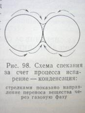 На рис. 98 приведена схема спекания двух соприкасающихся сферических частиц по мех-му исп-конд. При соприкосновении зерен между ними обр-ся перемычка с вогнутой поверхностью с небольшим отрицательным радиусом кривизны, упругость пара над которой меньше, чем над выпуклой поверхностью зерен. Поэтому при температуре, достаточной для возгонки твердой фазы, начнется перенос вещества через газовую фазу с поверхности зерен к поверхности перемычки и конденсация вещества на ней. За счет этого будет происходить увеличение площади контакта между зернами и повышение прочности мате риала. По мере расширения перемычки ее радиус кривизны будет увеличиваться, а кривизна уменьшаться, что будет приводить к уменьшению разницы в упругости пара над поверхностью зерен и перемычки. В результате этого процесс переноса вещества будет замедляться. Установлено, что при изотермическом процессе скорость роста площади контакта между зернами пропорциональна t2-/3 (t- время). Особенности: Процесс испарение — конденсация может играть заметную роль при спекании только таких веществ, которые достаточно интенсивно возгоняются при высокой температуре, т. е. имеют достаточно высокую упругость пара (порядка 1...10 Па). Для многих материалов, в частности для большинства тугоплавких оксидов, упругость пара при температурах их обжига недостаточна для протекания спекания по механизму испарение — конденсация, поэтому этот вид спекания для них не характерен. Однако такой, например, материал, как SiC, имеет при 2200...2400 °С достаточно высокую упругость пара (10...100 Па), и поэтому процесс его спекания через газовую фазу протекает весьма интенсивно. Спекание за счет процесса испарение — конденсация отличается по некоторым признакам от других видов спекания, что обусловлено особенностями механизма этого процесса. При этом виде спекания вещество не перераспределяется из области контакта между зернами и из их внутренних частей, а переносится только с поверхности зерен на поверхность перемычки между ними. Следствием этого является то, что центры зерен при спекании практически не сближаются, т. е. ощутимая усадка отсутствует, а общая пористость материала не уменьшается (происходит только перераспределение пор по размерам и изменение их формы). Этот вид спекания не сопровождается существенным уплотнением материала, хотя прочность спекающегося тела за счет увеличения контактов между зернами повышается. CПЕКАНИЕ ЗА СЧЕТ ПЛАСТИЧЕСКОЙ ДЕФОРМАЦИИ ПОД ДАВЛЕНИЕМ/ Это спекание можно рассматривать как разновидность твердо-фазового спекания (хотя в принципе оно может осуществляться и при наличии жидкой фазы). Однако в отличие от последнего, при котором спекающееся тело подвергается действию только температуры, при спекании за счет пластической деформации спекающееся тело подвергается одновременному воздействию температуры и внешнему давлению (прессованию), т. е. подвергается так называемому горячему прессованию. Механизм этого вида спекания заключается в том, что нагретое до высокой температуры кристаллическое тело под действием давления приобретает способность к достаточно интенсивной пластической деформации (вязкому течению), за счет чего происходит перераспределение вещества с заполнением пор. Кроме того, в этом виде спекания участвует (особенно на конечной стадии