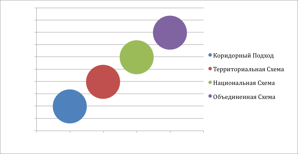 Процесс установления платы за пользование дорог может быть классифицирован в несколько отдельных этапов, следуя разным принципам: ■ Коридорный подход. Взимается при использовании конкретной дороги, которая обеспечивает прохождение транспортных средств из одного места в другое, например, традиционные платных дорог. Основная цель: получение доходов для оплаты дороги. ■ Территориальная схема. Взимание платы производится за въезд в область тесно интегрированной системы дорог. Взимания сборов применяется для управления городскими заторами. Цель заключаются в улучшении условий дорожного движения, а так же получения дохода. ■ Национальные и транснациональные системы. Область дорожных сборов распространяется на более широкую сеть автомобильных дорог, а не отдельные зоны. Цель заключается в регулировании расстояния в трафике внутри сети и устанавливаются более продвинутая структура сборов, чем традиционные сборы с транспортного средства и налоги на топливо. ■ Объединение. Взгляд в будущее, в котором пользователям предлагается сделать осознанный выбор конкретного вида транспорта на каждом этапе своего путешествия. Сборы будут стимулировать путешественника в выборе наиболее эффективного вида транспорта. На высоком уровне, этапы иллюстрируют компромисс между общей эффек-тивностью использования дорог, сложностями и рисками, заложенными в индивидуальных схемах платных дорог. РИСУНОК 7. ЧЕТЫРЕ СТАДИИ ФОРМИРОВАНИЯ ПЛАТНЫХ ДОРОГ