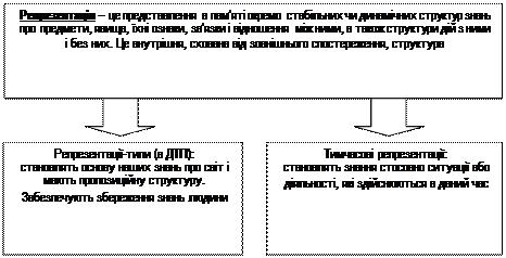 Рис. 14.9. Тимчасові репрезентації. До класу таксономічних моделей входить багато теорій, для яких характерне насамперед розуміння того, що є ознакою і які правила організації ознак у таксономії (включення до класу, частина-ціле тощо). Наприклад, Є. Шобен і Л. Ріпс виокремили дефінітивні й характеристичні ознаки. Можна виокремити клас теорій, у яких допускають існування двох форм репрезентації, принципово відмінних одна від одної. Найбільшого поширення набула дихотомія пропозиціональної та аналогової форм. Класичною є модель А. Пайвіо – модель подвійного кодування. Вважають, що вербальні й невербальні символічні системи функціонують у різний спосіб. Виокремлено дві системи: система вербальної й образної репрезентації. Одиницями вербальної репрезентації є логогени (Дж. Мортон) – «схожі на слова сутності, що містять візуальні й фонематичні ознаки» (Кларк). Невербальна система працює за допомогою імагенів, які «кодують модально-специфічну інформацію про невербальний, перцептивний і сенсорно-моторний досвіди» (Кларк). У невербальній системі об’єкти зберігаються як інтегративні, континуальні, холістичні репрезентанти, які «неможливо легко розділити на окремі елементи». Відповідно до теорії подвійного кодування, логогени та імагени працюють на 3-х рівнях. На першому (найнижчому) рівні – процесах репрезентації – логогени та імагени активуються відповідними об’єктами або словами. Вони керуються фізичними характеристиками слів і об’єктів. Психологічним корелятом цих процесів є знайомість. На другому рівні – референції – логогени та імагени взаємно активують один одного. Цьому рівневі відповідає «назвати слово» або «назвати картинку». І нарешті, на третьому – асоціативному – рівні відбувається активація одних логогенів за допомогою інших і одних імагенів – за допомогою інших. Це – система репрезентації абстрактних слів і складних просторових образів. На цьому рівні кодування немає прямого переходу між логогенами та імагенами. Відповідно до цієї моделі, продуктивність запам’ятовування підвищується в тому разі, якщо інформація має подвійну форму кодування. Образна пам’ять має велику стійкість порівняно з вербальною пам’яттю. Переваги образної пам’яті особливо виявляються в тестах на пізнавання (порівняно з відтворенням – безпосереднім і відтермінованим). Зокрема, у розробленні більшості мнемонік використовують образний код для підвищення продуктивності запам’ятовування. Декларативна і процедурна пам’ять. Уперше розподіл на процедурну і декларативну пам’ять описав К. Кохен з колегами у термінах «знати що» і «знати як». Вважали, що процедурне знання спрямоване автоматизмами, мало усвідомлене і його важко вербалізувати. Щоб актуалізувати декларативне знання, потрібне усвідомлення. Обидва види знань беруть участь у процесі когнітивної переробки. Декларативне знання може переходити в процедурне в міру його автоматизації. Є нейропсихологічні обґрунтування правомірності виокремлення цих форм пам’яті: за даними Л. Скваєра, під час хвороби Паркінсона наявна патологія в когнітивних навичках, однак залишаються збереженими відтворення і пізнавання, тоді як у разі хвороби Альцгеймера – навпаки. Ж.-Фр. Рішар, досліджуючи природу функціонування знань, пропонує в аналізі репрезентацій використовувати таку схе