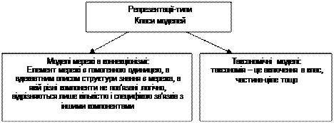 Рис. 14.6. Пам’ять та репрезентація знань Ж.-Фр. Рішар розрізняв репрезентації-типи (рис. 14.7) і тимчасові репрезентації (рис. 14.8). Перші становлять основу наших знань про світ і мають пропозиціональну структуру. Другі – основа форм, у яких виявляються знання щодо певної ситуації. Ж.-Фр. Рішар розрізняє власне знання і поточні репрезентації. Останні є частиною тривалої пам’яті і відповідають за відображення ситуації, пов’язаної з певною діяльністю. Структура постійних репрезентацій у ДТП. Одні автори думають, що існує єдиний формат збереження для всіх знань. Розроблено різні моделі, які дають уявлення про те, як співвідносяться між собою різні компоненти знання (концепти, категорії, ознаки). Найбільш загально можна виокремити два класи моделей: • моделі мережі, розроблювальні в основному в коннекціонізмі; • таксономічні моделі. Прихильники коннекціоністського підходу відштовхуються від того, що елемент мережі є гомогенною одиницею, а адекватним описом структури знання є мережа, у якій різні компоненти, нерозрізнені з логічного погляду, відрізняються лише кількістю і специфікою зв’язків з іншими компонентами. Ці зв’язки дають змогу побудувати пропозиціональні мережі із заданими заздалегідь операціями (частина чогось є предикатом тощо). За допомогою коннекціоністських моделей вдається показати, що внесок окремих компонентів у визначенні категорії не є стабільним. Він змінюється залежно від того, які ще компоненти використовують.