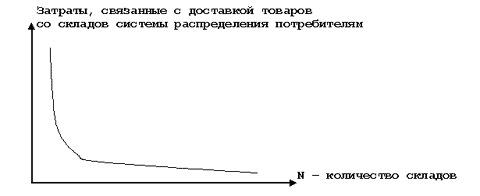 Суммарные транспортные расходы при увеличении количества складов в системе распределения, как правило, убывают. Однако это снижение не носит столь выраженный характер, как снижение расходов на ближние перевозки, так как на форму зависимости влияет увеличение расходов на завоз товаров на склады (при увеличении количества складов). Общий график зависимости транспортных расходов от количества используемых складов приведен на рис.3