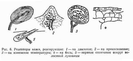 Понятие рефлекса. Основной формой нервной деятельности являются рефлекторные акты. Рефлекс — ответная реакция организма на раздражение из внешней или внутренней среды, осуществляемая при посредстве центральной нервной системы. Раздражение кожи подошвенной части ноги у человека вызывает рефлекторное сгибание стопы и пальцев. Это подошвенный рефлекс. При ударе по сухожилию четырехглавой мышцы бедра под надколенником нога разгибается в колене. Это коленный рефлекс. Прикосновение к губам грудного ребенка вызывает у него сосательные движения — сосательный рефлекс. Освещение ярким светом глаза вызывает сужение зрачка — зрачковый рефлекс. Благодаря рефлекторной деятельности организм способен быстро реагировать на различные изменения внешней или внутренней среды. Рефлекторные реакции весьма разнообразны. Они могут быть условными или безусловными. Различия между ними мы рассмотрим позднее. Рефлекторная дуга. Во всех органах тела располагаются нервные окончания, чувствительные к раздражителям, — рецепторы.