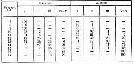 Понятие о половом созревании. Половые железы и связанные с ними признаки пола, закладываясь во внутриутробном периоде, формируются на протяжении всего периода детства и определяют половое развитие. Половые железы, их функции неразрывно связаны с целостным процессом развития ребенка. На определенном этапе онтогенеза половое развитие резко ускоряется и наступает физиологическая половая зрелость. Период ускоренного полового развития и достижение половой зрелости называется периодом полового созревания. Этот период приходится в основном на подростковый возраст. Половое созревание девочек на 1—2 года опережает половое созревание мальчиков, имеется и значительный индивидуальный разброс в сроках и темпах полового созревания. Сроки наступления полового созревания и его интенсивность различны и зависят от многих факторов: состояния здоровья, характера питания, климата, бытовых и социально-экономических условий. -Немаловажную роль играют и наследственные особенности. Неблагоприятные бытовые условия, неполноценная пища, недостаток в ней витаминов, тяжелые или повторные заболевания ведут к задержке полового созревания. В больших городах половое созревание подростков обычно наступает раньше, чем в сельской местности. В период полового созревания происходят глубокие изменения организма. Изменяются взаимоотношения эндокринных желез и прежде всего гипоталамо-гипофизарной системы. Активируются структуры гипоталамуса, нейросекреты которых стимулируют выделение тропных гормонов гипофиза. Под влиянием гормонов гипофиза усиливается рост тела в длину. Гипофиз также стимулирует деятельность щитовидной железы, отчего, особенно у девочек, во время полового созревания заметно увеличивается щитовидная железа. Возросшая активность гипофиза приводит к усилению деятельности надпочечников, начинается активная деятельность половых желез, усиливающаяся секреция половых гормонов приводит к развитию так называемых вторичных половых признаков — особенностей телосложения, оволосения, тембра голоса, развитию молочных желез. Половые железы и строение половых органов относят к первичным половый признакам. Стадии полового созревания. Половое созревание не плавный процесс, в нем выделяют определенные стадии, каждая из которых характеризуется спецификой функционирования желез внутренней секреции и соответственно всего организма в целом. Стадии определяются по совокупности первичных и вторичных половых признаков. Как у мальчиков, так и у девочек выделяют 5 стадий полового созревания (табл. 7).