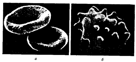 Рис. 11. Эритроциты: a — нормальные эритроциты в форме двояковогнутого диска; б — сморщенные эритроциты в гипертоническом солевом растворе Если во вдыхаемом воздухе оказывается угарный газ СО, то он вступает с гемоглобином крови в химическое взаимодействие, в результате которого образуется прочное вещество метоксигемоглобин, не распадающееся в легких. Тем самым гемоглобин крови выводится из процесса переноса кислорода, ткани не получают нужного количества кислорода, и человек ощущает удушье. В этом заключается механизм отравления человека на пожаре. Сходное действие оказывают некоторые другие мгновенные яды, которые также выводят из строя молекулы гемоглобина, например синильная кислота и ее соли (цианиды).