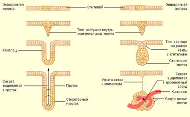 Многослойный плоский ороговевающий эпителий – эпидермис. Он покрывает поверхность кожи. Эпидермис состоит из многих десятков слоёв клеток. На поверхности кожи клетки гибнут, превращаясь в роговые чешуйки. В них разрушается ядро и цитоплазма и накапливается кератин. Многослойный плоский неороговевающий эпителий выстилает роговицу глаза, полость рта, пищевода. Есть переходная форма многослойного эпителия – переходный. Он покрывает мочевыводящие пути – почечную лоханку, мочевой пузырь, т.е. органы, способные менять свой объём. Железистый эпителий составляет основную массу желёз организма. Железы в организме выполняют секреторную функцию. Выделяемый им секрет необходим для процессов протекающих в организме. Некоторые железы являются самостоятельными органами, например поджелудочная железа, большие слюнные железы. Другие железы входят в состав органов, например железы стенки кишечника, желудка. Большинство желёз это производные эпителия. Различают железы внешней секреции – экзокринные. Они имеют выводные протоки и выделяют свой секрет в полости тела или на поверхность тела. Это молочные железы, потовые, слюнные. Есть железы внутренней секреции – эндокринные. Они не имеют выводных протоков и выделяют свой секрет во внутреннюю среду организма – кровь или лимфу. Их секрет – гормоны. Есть железы смешанной секреции. Они имеют эндокринную и экзокринную части, например поджелудочная железа.