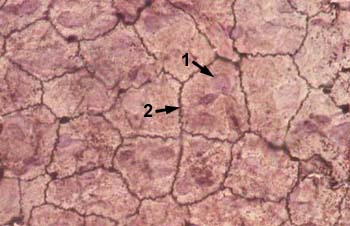| ОДНОСЛОЙНЫЙ ПЛОСКИЙ ЭПИТЕЛИЙ Окраска гематоксилин-эозином Стрелкой показаны ядра эпителиоцитов