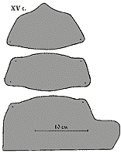 Под латную рукавицу настоятельно рекомендуется поддевать перчатку или рукавицу (лучше из кожи) с усиленной внешней стороной (например, простеганной войлоком) для дополнительной защиты суставов, начинать изготовление стоит именно с подбора этой части защиты, а от нее уже строить выкройки металлических деталей. Итак, у нас есть кожаная или матерчатая перчатка (рукавица) покрывающая ладонь, запястье, и заходящая на предплечье, простеганная и прошитая, и полностью готовая к использованию. Наденьте ее и сожмите в руке обрезок круглой деревянной палки, диаметром, примерно соответствующим диаметру рукояти меча – около 3 см. Затем замерим ширины (Ш) и толщины (Т) ладони в перчатке в области пальцевых суставов, а так же длины фаланг. Как видно из схемы, в основе выкроек лежат три трапеции, по одной на фалангу. Верхние и нижние основания трапеций получим по формуле Р=Ш+2Т; нижние (с учетом перекрытия нижней пластины верхней) сделаем на 0, 5-1 см шире. Длину деталей возьмите равной длине соответствующей фаланги плюс 1, 5-2 см на перекрытие. Не делайте слишком больших припусков – ладонь должна достаточно свободно сидеть в рукавице, но в тоже время не болтаться в ней. Теперь просто останется расчертить схему перчатки и нарисовать по ней контуры деталей. Если указанные построения кажутся слишком путанными и непонятными можно просто взять готовые выкройки. Приведенные выкройки сделаны на ладонь шириной 9, 5 см и общей длиной (от запястья) 19 см.