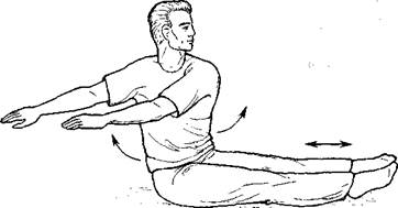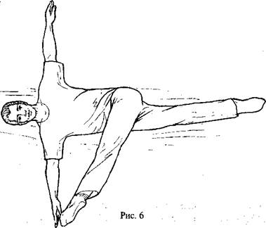 Рис.8 9. Приподнять верхнюю и нижнюю части тела, то есть лежать на ягодицах. Медленно левым плечом и вытянутыми руками начать вращение вправо, а вытянутой правой ногой влево, тело при этом как бы перекручивается. Вначале делать это упражнение просто лежа на полу, затем, постепенно его усиливая, приподнимать тело. Постараться правым плечом достать левое согнутое колено, и наоборот (рис. 9).