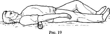 Лечь на кровать на спину так, чтобы голова свободно свисала, медленно опускайте ее так, чтобы посмотреть на пол. Немного подержав ее в таком положении, потихоньку поднять голову и посмотреть на ноги. Повторить несколько раз. Затем также на весу спокойно поворачивать голову влево-вправо, без напряжения, постепенно увеличивая угол поворота. Затем по-вращайте головой по и против часовой стрелки. Это упражнение способствует улучшению кровоснабжения мозга, снятию напряжения в мышцах и связочном аппарате шеи, укрепляет шейные позвонки (рис. 17). 18. Сидя или стоя, используя массажеры (шарики на веревочках), массируйте ими шею, воротниковую зону шеи через плечо справа налево и наоборот, что также будет способствовать устранению кифоза (горба) в верхнем отделе позвоночника (рис. 18). 19. Лежа на спине, под нее подложить палку диаметром 4-6 см. Лучше использовать полиэтиленовую бутылку объемом 1 л, наполненную водой. С помощью ног «кантоваться» вперед-назад. При этом особенно хорошо прорабатываются позвонки грудного отдела, что позволит вам избавиться от кифоза (рис. 19).