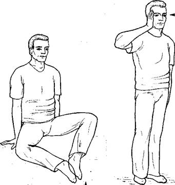 Рис. 30 32. Стоять свободно. Подняться немного на носки и с силой свободно падающего тела резко опуститься на пятки. Вначале это делать мягко. Второй вариант упражнения: одна нога чуть согнута в колене, пятка поднята вверх. Резко опустить ее вниз, вторая нога выходит в исходное, полусогнутое положение. Вы как бы переступаете ногами (рис. 32). 33. Встать прямо. Вытянуть руки перед собой, согнуть в локтях под прямым углом, пальцы сжать в кулак. Отводя локти как рычаги как можно дальше за спину, подбородком тянуться вверх. Руки работают как рычаги, разводятся, сводятся. Усилить упражнение за счет разворота плеч влево, смотреть вправо, и наоборот, таз фиксирован (рис. 33). 34. Сесть на пол или на пятки. Раскачивать тело во все стороны, втягивая и выпячивая живот (рис. 34).