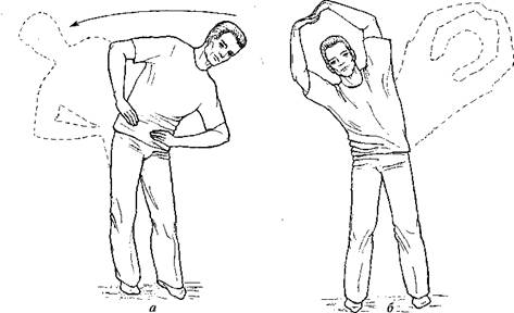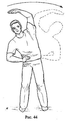 44. Наклоны тела влево-вправо (рис. 44): одно положение, когда руки на поясе (а), другое — руки сомкнуты вверху (б), третье — вместе с наклонами делают махи руками (в). Устраняются жировые отложения на талии, сколиоз и т. п. 45. Представьте себе, что вы берете лопатой песок и забрасываете его в кузов машины. Делаете наклон и с разворотом слева направо и за спину вверх делаете несколько движений. Затем справа налево вверх. Это упражнение важно для тех, кто страдает радикулитом, миозитом, остеохондрозом, что