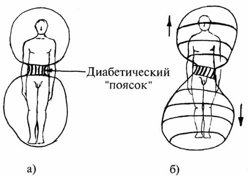 В ходе исследовательских работ был разработан принцип языка прямого доступа к подсознанию испытуемого. С помощью этого языка удалось обеспечить включение генной памяти испытуемых и через измерение параметров их энергетических оболочек получать информацию о состоянии энергозапаса их генетических предков на протяжении времени жизни последних. Таким образом, удалось проследить " генеалогические деревья развития заболеваний и аномальных поведенческих стереотипов". Энергоинформационная природа диабета Как уже отмечалось выше, энергетическую оболочку человека формирует несколько энергетических специализированных центров. " Центр жизнеобеспечения" контролирует деятельность желудка и поджелудочной железы, а также печени. Энергоинформационный стресс как разовый, импульсный, так и накопленный, минимизирует активность этого центра (а), либо ДЕЗОРИЕНТИРУЕТ поляризацию этого центра (б) (рис. 7 а, б).