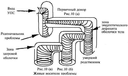 При возникшей энергонедостаточности центра жизнеобеспечения задействуются механизмы социально-биологической стабилизации, и недостающие фрагменты энергетической оболочки компенсируются за счет оболочек генетических родственников (рис. 8). Корректным является поддержание попавшего в энергетическую беду человека на срок до двух недель (пол. фазы Луны). В противном случае, если не разорвать стабилизирующую связь, то застрессованный фрагмент тела утрачивает матрицу воссоздания нормальных функций и переходит на режим стабильного паразитирования на доноре.