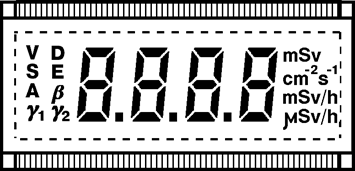 4.2.1. Блок-схема измерительного блока (пульта) представлена на Рис.4. Пульт включает в себя следующие блоки: - центральный процессор (ЦП); - контроллер индикатора (КИ); - контроллер клавиатуры (КК); - контроллер разъема (КР); - специализированный жидкокристаллический индикатор (ЖКИ); - 3 независимых источника высоковольтного питания (ИП1, ИП2, ИП3); - блок клавиатуры (К); - репрограмируемое запоминающее устройство (РПЗУ); - двух встроенных детектор СБМ-32 (С1); - встроенный детектор СИ-34ГМ (С2); - блок обработки сигнала (Б); - разъем 2РМ-7 (Р); - элемент питания 9В. 4.2.2. Схема работает следующим образом. В результате воздействия ионизирующего излучения на выходе детекторов появляются импульсы, которые поступают в блок обработки сигнала и далее на центральный процессор и преобразуется в звуковую сигнализацию и цифровую информацию о значениях мощности эквивалентной дозы ионизирующего фотонного излучения (далее МЭД), эквивалентной дозы ионизирующего фотонного излучения (далее ЭД), плотности потока a-, b-частиц, удельной активности. Цифровая информация поступает на ЖКИ. Времена измерения по каждому каналу, коэффициент пересчета дозы хранятся в энергонезависимом РПЗУ и могут быть изменены только при переключении внутреннего переключателя. 4.2.3. Внешний вид передней панели показан на Рис.5.