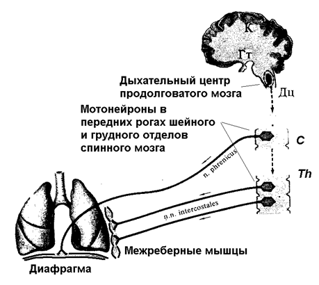Движения диафрагмы Диафрагма является наиболее сильной мышцей вдоха, обеспечивающей примерно 2/3 вентиляции. Диафрагма иннервируется диафрагмальными нервами от сегментов С3 – С5 . Во время вдоха диафрагма уплощается в результате сокращения ее мышечных волокон и отходит от внутренней поверхности грудной клетки, размер грудной клетки увеличивается (рис.1Б). При спокойном дыхании объем грудной клетки изменяется в основном за счет сокращения диафрагмы и перемещения ее купола. Перемещение диафрагмы всего на 1 см соответствует увеличение емкости грудной полости примерно на 200 - 300 мл. При глубоком форсированном дыхании участвуют дополнительные мышцы вдоха: трапециевидные, передние лестничные и грудино-ключично-сосцевидные мышцы. Они включаются в активный процесс дыхания при значительно больших величинах легочной вентиляции, например, при восхождении альпинистов на большие высоты или при дыхательной недостаточности, когда в процесс дыхания вступают почти все мышцы туловища. Верхние отделы грудной клетки на вдохе расширяются преимущественно в переднезаднем направлении, а нижние отделы больше расширяются в боковых направлениях, так как ось вращения нижних ребер занимает сагиттальное положение. В зависимости от того, связано ли расширение грудной клетки при нормальном дыхании преимущественно с поднятием ребер или уплощением диафрагмы, различают грудной и брюшной типы дыхания. Брюшной тип дыхания более эффективен, поскольку при нем интенсивнее вентилируются легкие, и облегчается венозный возврат крови от органов брюшной полости к сердцу. Именно поэтому при обморочных состояниях, когда резко снижается величина венозного возврата к сердцу, что чревато развитием нарушений его функции, пациента кладут на горизонтальную поверхность, нижние конечности приподнимают и просят дышать «животом». При ряде заболеваний, когда требуется усилить деятельность дыхательного аппарата, в акт вдоха могут включаться кроме основных дыхательных мышц, вспомогательные мышцы, к которым относятся все мышцы, прикрепляющиеся к костям плечевого пояса, черепу, позвоночнику и способные поднимать ребра. Важнейшие из них – это большие и малые грудные, лестничные, грудино-ключично-сосцевидные и, частично, зубчатые. Включение этих мышц в акт вдоха достигается специфической позой, когда больной упирается руками в неподвижный предмет, в результате чего плечи фиксируются и отклоняют голову назад. К важнейшим вспомогательным экспираторным мышцам относятся мышцы брюшного пресса, подтягивающие ребра вниз и сдавливающие органы брюшной полости. Иннервация дыхательных мышц осуществляется соматическими нервами, мотонейроны которых расположены в шейном (n. phrenicus) и грудном отделе спинного мозга (n.n. intercjstales). Мотонейроны этих нервов находятся под управлением дыхательного центра продолговатого мозга. Вместе с тем, поскольку эти нервы иннервируют скелетные мышцы, возможно и произвольное управление дыханием (рисунок 2).