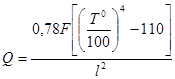 где Q - энергия теплового излучения, Вт/м2; F - площадь излучающей поверхности, м2; Т0- температура излучающей поверхности, °К; l - расстояние от излучающей поверхности до объекта, м. Из формулы (1) следует, что количество лучистого тепла, поглощаемого телом человека, зависит от температуры источника излучения, площади излучающей поверхности, от квадрата расстояния между излучающей поверхностью и телом человека. Тепловой обмен организма человека с окружающей средой заключается во взаимосвязи между образованием тепла (термогенезом) в результате жизнедеятельности организма и отдачей им этого тепла во внешнюю среду. Теплообмен осуществляется конвекцией в результате омывания тела воздухом, теплопроводностью, излучением и в процессе тепломассобмена (при испарении влаги, выводимой на поверхность кожи потовыми железами, и при дыхании). Отдача тепла осуществляется, в основном тремя способами: конвекцией, излучением и испарением. Передача тепла путем излучения является наиболее эффективным способом теплоотдачи и составляет в комфортных метеоусловиях 44-59% общей теплоотдачи. Тело человека излучает в диапазоне волн от 5 до 25 мкм с максимумом энергии для волны длиной 9, 4 мкм. Отдача человеческим телом тепла во внешнюю среду за счет излучения возможна лишь тогда, когда температура окружающих предметов ниже температуры тела человека. В обратном случае направление потока лучистой энергии меняется на противоположное, и уже тело человека будет получать извне дополнительную тепловую энергию. Воздействие теплового излучения приводит к перегреву организма, и тем быстрее, чем больше мощность излучения, выше температура и влажность воздуха в помещении, выше интенсивность выполняемой работы.