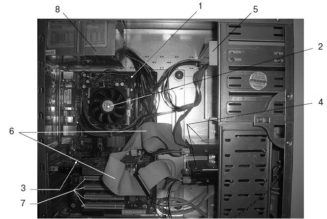 Рис. 1.3.Компьютер изнутри Слоты расширения, в которые устанавливаются дополнительные платы расширения, изображены под номером 7. Номер 8 – это блок питания. Полный список компонентов ПК • Материнская плата (mother board) – самая главная часть компьютера, к которой подключаются все остальные его компоненты. Рассматривается в главе 3. • Процессор (processor, CPU, central processing unit) – производит обработку данных. Рассматривается в главе 2. Оперативная память (ram, random access memory) – используется для хранения выполняемых программ и данных, обрабатываемых процессором. Рассматривается в главе 4. Корпус (case) – «рама» компьютера, в которую устанавливаются все комплектующие. Рассматривается в главе 13. Блок питания (power unit) – обычно поставляется вместе с корпусом, но является отдельной частью компьютера. Подает питание на материнскую плату и другие компоненты компьютера. Подробно рассмотрен в главе 13. Жесткий диск (hdd, hard disk drive) – используется для хранения постоянных данных (ведь содержимое оперативной памяти стирается при выключении питания). Рассматривается в главе 6. Дисковод для гибких дисков (FDD, floppy disk drive) – на современных компьютерах часто не устанавливают FDD, но, возможно, вы все-таки захотите его иметь в комплектации своей машины. Описывается в главе 8. Привод cd/DVD – целесообразно приобрести пишущий DVD-привод, хотя можно и сэкономить, поставив на ПК комбинированный (combo) привод, умеющий читать и записывать CD-диски и только читать DVD-диски. Приводы CD/DVD рассмотрены в главе 7. Видеокарта (video card) – отвечает за вывод информации на монитор (дисплей). В некоторых случаях может быть встроенной в материнскую плату. Описывается в главе 11. Звуковая карта (sound card) – используется для воспроизведения звука, обычно встроена в материнскую плату. Рассматривается в главе 12. Сетевая карта (network card) – используется для подключения к локальной сети, обычно встроена в материнскую плату. На современных компьютерах имеются сетевые платы, позволяющие подключаться к сети стандарта Fast Ethernet/Gigabit Ethernet (скорость 100/1000 Мб/с). Монитор (monitor, display) – используется для отображения информации, подключается к видеокарте. Компьютер может прекрасно работать и без монитора, если он не предназначен для работы с пользователем. Но такие компьютеры мы рассматривать не будем. Мониторы описаны в главе 15. Клавиатура (keyboard) – устройство для ввода данных. Клавиатуры и другие устройства ввода описаны в главе 13. Мышь (mouse) – без манипулятора мышь работать с современным компьютером очень неудобно, поэтому мышь (или другое указательное устройство, например TouchPad на ноутбуках) является обязательным компонентом компьютера.