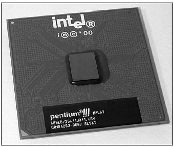 Рис. 2.2.Процессор Intel pentium ii В 1998 году была выпущена облегченная версия Pentium II – процессор Intel Celeron (до 433 МГц для Slot-1). Первые версии Celeron не имели кэш-памяти (специальная быстродействующая память, использующаяся для быстрого доступа к информации, которую недавно использовал процессор) второго уровня, поэтому работали медленнее, чем Pentium II. Но чуть позже были выпущены процессоры Celeron, которые по своей производительности превосходили процессоры Pentium II. В 1999 году был выпущен процессор Pentium III на базе ядра Katmai. Он также был выполнен в виде картриджа (слот для этого процессора назывался Slot II), тактовая частота достигала 600 МГц. Особенность данного процессора – инструкции SSE (Streaming SIMD Extensions) и расширенный набор команд MMX. Также в 1999 году был выпущен процессор Pentium III на базе ядра Coppermine (рис. 2.3). Заявленная тактовая частота – до 1200 МГц. Первые процессоры на базе Coppermine работали довольно нестабильно в предельных режимах, что подмочило репутацию компании Intel. По зже Intel исправилась. В отличие от Pentium II и первого Pentium III, данный процессор выполнен не в виде картриджа, а в виде обычного процессора (гнездо называлось Socket 370). Еще в 1999 году появился процессор Intel Celeron Coppermine – усовершенствованная версия Intel Celeron; как и PIII Coopermine, новый Celeron устанавливался в гнездо Socket 370, а его частота не превышала 1100 МГц.