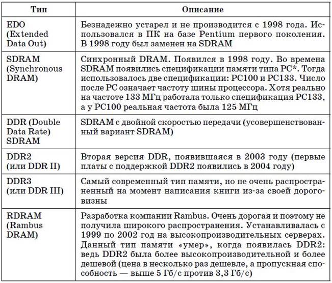 Выбор чипсета Из предыдущей главы вы узнали, что FSB (Front Side Bus), системная шина, обеспечивает связь процессора с внешним миром, то есть со всеми остальными устройствами. Любой персональный компьютер строится так: процессор посредством FSB подключается к системному контроллеру, который обычно называют северным мостом (North Bridge). Глава 4 Оперативная память Оперативная память используется для временного хранения данных и выполняемых программ. Содержимое оперативной памяти стирается при выключении питания или нажатии кнопки Reset на системном блоке. Оперативную память правильнее называть памятью с произвольным доступом – RAM (Random Access Memory), поскольку обращение к данным, которые хранятся в оперативной памяти, не зависит от их расположения в ней. В России есть собственное определение RAM – оперативное запоминающее устройство (ОЗУ), отсюда еще одно наименование – оперативная память. Различные типы памяти В современных компьютерах встречаются три типа памяти (не оперативной, а вообще памяти): Современные типы памяти. Совместимость Сейчас основной тип памяти – DDR2. Однако память DDR до сих пор в ходу и будет еще использоваться пару лет, пока все полностью не перейдут на DDR2.
