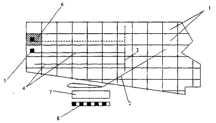 Рисунок 1. Схема размещения лесозаготовительного предприятия 1 – лесосырьевая база с квартальной сеткой; 2 – магистральный участок лесовозной дороги; 3 – лесовозные ветки; 4 – лесовозные усы; 5 – погрузочные пункты; 6 – лесосека; 7 – нижний лесной склад; 8 – УЖД