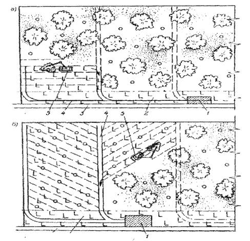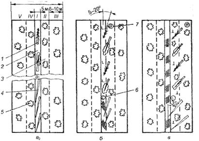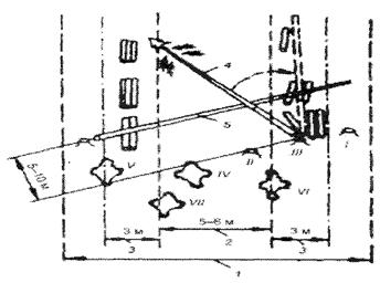 Рисунок 6. Схемы разработки пасек ВТМ а) лентами, параллельными лесовозному усу; б) лентами под углом 45...60° к лесовозному усу: 1 – погрузочный пункт; 2 – зона безопасности; 3 – лесовозный ус; 4 – трелевочный волок; 5 – ВТМ