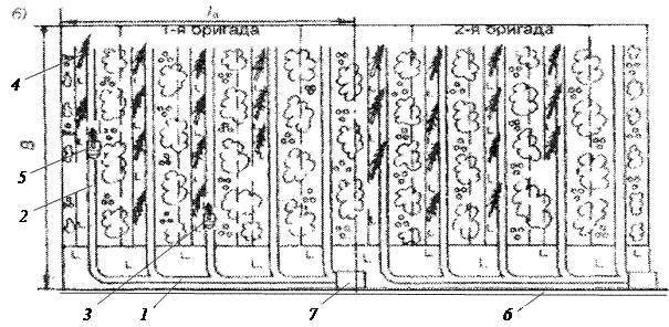 Рисунок 5. Схемы разработки лесосеки системой машин БП + БП + ТТ. а) схема разработки лесосеки (делянки): 1 – лесовозный ус, 2 – лесопогрузочный пункт, б) схема разработки пасеки
