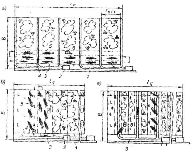 Параллельная схема расположения трелевочных волоков (рис.2, схема а) применяется на равнинных и суходольных лесосеках при тракторной трелевке. Магистральный волок располагается параллельно усу лесовозной дороги. Перпендикулярно магистральному волоку прокладываются пасечные волоки. Все пасеки имеют равные размеры, что облегчает организацию разработки пасек. Схему целесообразно использовать при трелевке с небольших лесосек с сохранением подроста и при создании запаса заготовленных на лесосеке деревьев. Применяется также схема размещения вальков с погрузкой заготовленного леса широким фронтом (рис.2, схема б). При работе по этой схеме вдоль уса трелевку не осуществляют, так как лесопогрузочные пункты располагаются вдоль всего уса. Расстояние трелевки при использовании этой схемы не будет большим, но трактор перемещается только по пасечным волокам. Веерная и диагональная схемы расположения волоков (рис.2, схемы в, г) находят применение при тракторной трелевке в равнинной или холмистой местности при наличии на лесосеках не эксплуатационных площадей (болот, вырубок, куртин молодняка). Магистральные волоки при диагональной схеме располагаются по диагоналям, пасеки примыкают к магистральному волоку под углом 45..60°. Расстояние трелевки при работе по этой схеме будет меньшим, чем при параллельной схеме. При веерной схеме лесосеку делят на секции. Посередине каждой секции прокладывают магистральный волок. В обе стороны от магистрального волока под прямым углом или под углом 45...60° идут пасечные волоки. Протяженность волоков и среднее расстояние трелевки по сравнению с другими схемами наибольшее. Веерная схема находит применение при тракторной трелевке, трелевке полуподвесными и подвесными установками с несущим канатом. Диагональную схему применяют при тракторной трелевке. Радиальная схема (рис.2, схема д) используется при трелевке канатными установками без несущего каната. Лесосеку разбивают на пасеки (сектора), в вершинах которых расположена трелевочная мачта. Эта схема обеспечивает минимальное расстояние трелевки, однако при этом возникает необходимость создания густой сети пасечных (секторных) волоков. Петлевую схему (рис.2, схемы е, ж) трелевочных волоков используют при разработке лесосек валочно-трелевочными или валочно-пакетирующими машинами и тракторами для бесчокерной трелевки. Среднее расстояние трелевки при равномерном распределении лесонасаждений по площади зависит от размеров лесосеки и схемы расположения на ней трелевочных волоков. Среднее расстояние трелевки может быть определено как частное от деления общей грузовой работы, совершенной при трелевке, на запас леса на лесосеке, т.е.