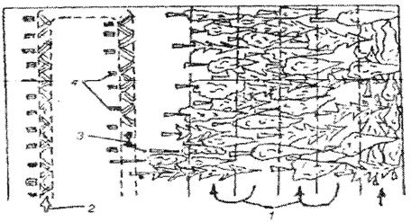 Рисунок 13. Схема разработки лесосеки бензопилой и процессором при сплошных рубках. 1 – направление движения вальщика; 2 – направление движения процессора; 3 – процессор; 4 – пакеты сортиментов