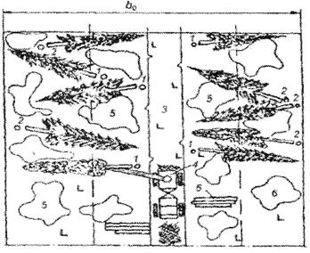 Рисунок 9. Схема разработки лесосеки ВТМ + ТТ + СМ: 1 – ус лесовозной дороги; 2 – волоки; 3 – погрузочный пункт; 4 – валочно-трелевочная машина ВТМ-49; 5 – трелевочный трактор ЛП-18А; б – разрабатываемая лента леса; 7 – растущий лес; 8 – деревья одного компонента; 9 – пачки деревьев другого компонента
