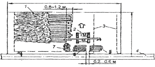 Рисунок 15. Схема работы процессора ЛО-120 на верхнем складе. 1 – штабель деревьев; 2 – процессор ЛО-120; 3 – погрузочный тупик для автолесовоза; 4 – лесовозный ус; 5 – штабель балансовой древесины; 6 – штабель крупномерных сортиментов; 7 – сучья и вершинки