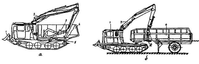 Рисунок 29. Схемы подборщиков лесосечных отходов манипуляторного типа а) подборщик ЛТ-23: 1 – толкатель; 2 – гидроманипулятор; 3 – челюстной захват; 4 – кузов; 5 – механизм опрокидывания; б) подборщик ЛТ-168: 1 – базовый трактор ТБ-1; 2 – челюстной захват; 3 – гидроманипулятор; 4 – седельный полуприцеп Подборщик ЛП-23 создан на базе бесчокерной машины ТБ-1. Подборщик обеспечивает выполнение: сбора и погрузки порубочных остатков в кузов на лесосеке, подвозку их к лесовозной дороге и разгрузку, погрузку в транспортные средства. Подборщик ЛТ-168 разработан на базе бесчокерной машины ТБ-1 и имеет одноосный седельный прицеп. Подборщик ПЛО-1А создан на базе трактора ТДТ-55 и имеет кузов, расположенный на раме трактора. Техническая характеристика подборщиков манипуляторного типа приведена в таблице 7. Производительность подборщика лесосечных отходов манипуляторного типа определяется по формуле: