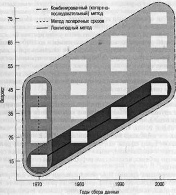 Рис. 1.2. Сравнение основных методов исследования развития. Основные методы исследования: лонгитюдный, поперечных срезов и комбинированный (ко-гортно-последовательный). Диагональные ряды (см. нижний ряд, выделенный темно-серым цветом) символизируют лонгитюдные исследования, а вертикальные колонки (см. вертикальную колонку, выделенную средне-серым цветом) -исследования при помощи метода поперечных срезов. Весь рисунок представляет собой когортно-последовательный метод, на котором показаны четыре возрастные когорты, изучаемые в четырех различных точках жизненного пути Другой проблемой, связанной с методом лонгитюда, является потенциальная возможность искажения. Первоначально исследователи выделяют выборку, являющуюся репрезентативной для интересующей их популяции. По мере продолжения исследования участники могут заболевать, уходить на каникулы, менять место жительства или иным способом прекращать участие в проекте, и, следовательно, оставшиеся участники больше не являются репрезентативными начальной Целевой популяции. Например, изучение личностных изменений может привести к искажению данных из-за того, что испытуемые, участвующие в лонгитюдном исследовании до его окончания, обычно обнаруживают устойчивые тенденции к сотрудничеству и эмоциональной стабильности, что приводит исследователей к мысли, что людям свойственно с возрастом становиться более склонными к сотрудничеству и стабильными. Подобным образом, участники лонгитюдных исследований могут быть здоровее, богаче и умнее, чем их сверстники. 42 Часть I. Начало Ученые тоже могут переехать, потерять интерес к проблеме, наконец, умереть, если исследование длится достаточно долго. Например, Терман умер в 50-е годы XX века, хотя его исследование продолжается и сегодня. Некоторые исследования личности, начатые в 1920-х и 1930-х годах, также продолжались после смерти их авторов. Среди них: исследование личности университета Беркли, начатое в 1928 году с 8- и 10-летними детьми и продолжившееся до 1990-х годов, и изучение личности взрослых, предпринятое Гарвардской медицинской школой (Brooks-Gunn, Berlin, Leventhal & Fuligni, 2000). В любом долговременном лонгитюдном проекте исходные цели и методы работы могут отстать от современных потребностей и достижений науки. Часто бывает довольно трудно включить в работу новые появившиеся подходы, продолжая при этом получать данные, сравнимые с полученными ранее результатами. Тем не менее благодаря лонгитюдным исследованиям можно получить детальную информацию об изменениях индивидуального развития, которую невозможно получить другими способами, и поэтому они остаются популярным научным методом. Как отмечали Джин Брукс-Ганн и ее коллеги (Brooks-Gunn, Berlin, Leventhal & Fuligni, 2000), после многолетнего перерыва сейчас только в США разворачиваются несколько новых крупномасштабных лонгитюдных проектов. Они охватывают такие сферы, как оценка преимуществ раннего развития, условия жизни детей в «неблагополучных» семьях, влияние динамики семейного дохода на развитие ребенка, воздействие реформ системы социального обеспечения и многие другие. Метод поперечных срезов. При использовании метода поперечных срезов одновременно сравниваются группы испытуемых разного возраста. Несмотря на то что при помощи такого подхода невозможно оценить индивидуальное развитие, по сравн