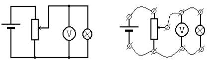 ПОРЯДОК СБОРКИ ЭЛЕКТРИЧЕСКИХ ЦЕПЕЙ 1. Перед началом сборки по заданной принципиальной схеме полезно начертить монтажную схему: указать клеммы, имеющиеся на приборах, соединить их в соответствии с принципиальной схемой линиями, обозначающими проводники, причем на каждой клемме соединять по возможности не более двух проводников. Пример на рисунке 1. 2. В процессе сборки реостаты следует установить на самое большое сопротивление; движки потенциометров устанавливать так, чтобы снимаемое напряжение равнялось нулю. Ключи должны быть разомкнуты. 3. Электроизмерительные приборы включать с соблюдением полярности. В многопредельных приборах выставлять максимальные пределы измерения.