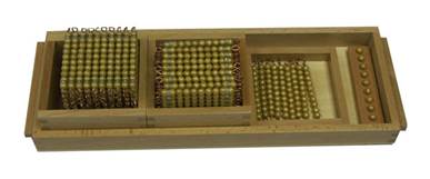 Эти материалы составляют вторую группу и предназначены для знакомства с многозначными числами и четырьмя основными арифметическими действиями с ними: сложением, вычитанием, умножением и делением. Материалы этой группы дают ребенку возможность понять, какова структура многозначных чисел, что такое разряд числа и как происходит переход из одного разряда в другой в ходе арифметических действий. Знаменитый золотой материал Монтессори из золотистых бусин позволяет не только увидеть, но и ощупать руками, ощутить форму и даже вес таких количеств, как несколько единиц, несколько десятков, сотен или тысяч бусин. Весьма важным является тот факт, что разрядам десятичной системы с помощью золотого материала дана геометрическая интерпретация. Отдельные бусины-единицы напоминают точки плоскости, не имеющие измерений. Стержни с нанизанными на них десятью бусинами — десятки — похожи на отрезки, имеющие только одно измерение — длину. Сотни представлены в виде квадратов из бусин, имеющих два измерения — длину и ширину. И наконец, тысячи — в форме трехмерных кубов из бусин. Подобная геометрическая интерпретация позволяет не только привлечь сенсорную сферу ребенка при изучении математики и существенно облегчить оперирование с количествами, соответствующими многозначным числам, но и опосредованно знакомит ребенка с квадратом и кубом числа 10. В дальнейшем этот и некоторые другие материалы помогут понять, почему 2-ю степень числа называют квадратом, а 3-ю — кубом этого числа. Подчеркнем, что при работе с золотым материалом еще не ставится задача обучения ребенка действиям с многозначными числами при письме по общепринятым правилам, поэтому в упражнениях с ним первоочередное значение имеет правильное выполнение хода действия, а не его результат. Результат, а также запись примеров (но еще не выполнение действий при письме) становится важным при проведении так называемых игр с марками. Переход к сложению и вычитанию в столбик осуществляется лишь по окончании работы с малыми счетами, к умножению в столбик — после упражнений с шахматной доской, а к делению уголком — посредством материала «большое деление». Отметим также, что арифметические действия с золотым материалом не требуют обязательного умения прочесть многозначное число общепринятым образом, например: «Три тысячи пятьсот шестьдесят семь». На этой стадии работы вполне достаточно, что ребенок ясно понимает, из единиц каких разрядов состоит число, и правильно их называет, например, в нашем случае: «Три тысячи, пять сотен, шесть десятков, семь единиц». Правильные названия чисел особенно интенсивно учат при помощи материалов третьей группы. При работе с материалами второй группы используются: золотой материал из бусин, большой набор карт 1—9000, большой набор карт 1 — 1000, три малых набора карт 1 — 3000, малый набор карт 1 — 9000, игры с марками, игра с точками, текстовые задания, а также малые, большие и лежащие счеты, шахматная доска, материал для большого деления. Прилагательные «большой» и «малый» в названиях наборов карт относятся не к их количеству, а к размерам изображенных на них чисел. На материалах второй группы ребенок знакомится с количествами, представляющими единицы разных разрядов чисел: с отдельными золотыми бусинами-единицами; стержнями-десятками, на которых нанизано по 10 