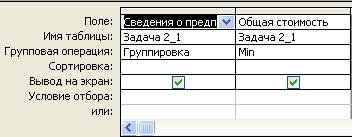 Для окончательного решения создаётся запрос «Задача 2_2» (итоговый запрос), в результате которого выводится таблица, с указанием поля «Общая стоимость». В бланке запроса по образцу (источником данных является «Задача 2_1») для поля: «Общая стоимость» используется групповая операция Min.