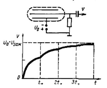 Рассмотрим качественно процесс, происходящий в цилиндрическом счетчике с тонкой нитью и достаточным для самостоятельного разряда напряжением. Пусть счетчик подключен к измерительному прибору, как это показано на рис. 2.9, и пусть постоянная RC много больше времени движения положительных ионов от анода к катоду.