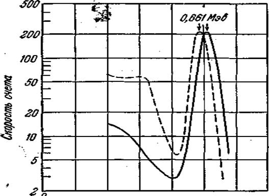 В кристаллах больших размеров действительно наблюдается существенное подавление непрерывного спектра комптоновских электронов отдачи и соответствующее увеличение интенсивности пика, отвечающего полному выделению энергии У-кванта (в принципе, в сцинтилляторе достаточно больших размеров каждой у-линии должен был бы отвечать только один пик — пик полного выделения энергии). На практике, однако, свести все импульсы от одной у-линии в один пик полностью не удается, так как в сцинтилляторе всегда имеют место краевые эффекты, особенно у поверхности, обращенной к источнику у-излучения. Лучшие результаты могут быть получены в том случае, когда источник у-лучей помещен внутри сцинтиллятора большого размера. На рис.6 приведено для примера распределение.импульсов по амплитудам для у-линии Сз137 (Е=0, 661 МэВ ), полученное с кристаллом NaJ(Т1) диаметром 12 см и высотой 12 см, источник у-лучей находился в центре кристалла. Пунктиром показано распределение импульсов по амплитудам, полученное с кристаллом много меньшего размера (диаметр 3 см, высота 2, 5 см). Некоторое смещение положения максимума в распределении обязано поглощению в большом кристалле рентгеновского излучения Ва137, образующегося при бета-распаде Сs-137. Из cравнения кривых видно, что часть спектра, отвечающая непрерывному распределению, в большом кристалле сильно подавлена. При работе с кристаллами больших размеров не следует забывать, что при каскадном испускании у-квантов в распределении импульсов по амплитудам возникают дополнительные пики, отвечающие суммарному выделению энергии в каскаде. Такой дополнительный пик возникает, например, при регистрации У-лучей Со60 с помощью кристалла большого размера. При анализе сложных у-спектров с целью измерения энергии и интенсивности отдельных у-линий часто используют специальные устройства, называемые сцинтилляционными у-спектрометрами, в которых с помощью двух или более кристаллов выделяется та или иная линия, характеризующая энергию у-квантов. Сцинтилляционные у-спектрометры, уступая другим видам у-спектрометров в разрешающей способности по энергии, значительно превосходят их по светосиле.
