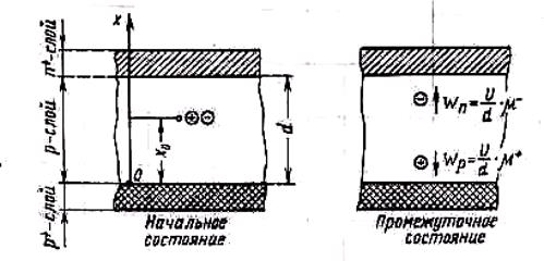 Рис. 3.9. Схема движения электронно-дырочной пары в детекторе с р-i-n-переходом и обратным смещением