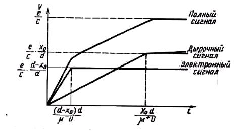 Рис. 3.10. Временная зависимость напряжения на выходе р-i-n-детектора при движении одной пары носителей в его объеме. Постоянная времени входной цепи усилителя много больше времени сбора носителя Существенное отличие формы импульса в полупроводниковом детекторе с р-i-n -переходом от формы импульса в ионизационной камере связано с тем, что в полупроводнике подвижности положительных и отрицательных носителей отличаются всего в несколько раз, в то время как в газе скорости дрейфа ионов и электронов различаются на три порядка. А это значит, что в полупроводниковых счетчиках отсутствует индукционный эффект, т.е. зависимость амплитуды сигнала от места образования носителей в тех случаях, когда постоянная времени входного устройства меньше времени сбора носителей. Утверждение, что сбор двух носителей – дырки и электрона – приводит к изменению первоначального заряда на один элементарный заряд, несправедливо в тех случаях, когда скорость дрейфа носителей перестает линейно зависеть от напряженности электрического поля. Это происходит тогда, когда поле становится настолько большим, что скорость носителей становится сравнимой с тепловыми скоростями носителей в решетке, которые близки к 107 см/с. Это ограничение существенно, когда рассматриваются быстрые кремниевые детекторы с тонкими слоями и германиевые детекторы, работающие при азотной температуре. В последнем случае подвижность носителей достигает насыщения при напряженности электрического поля порядка 1000 в/см. Характеристики, приведенные на рис. 10, соответствуют предположению, что скорость дрейфа дырок меньше скорости дрейфа электронов. Для германиевых детекторов, работающих при температуре 77 °К и напряженности поля порядка 1000 в/см, скорость дрейфа носителей разного знака становится близкой к 1, 5·107 см/с, т.е. максимальное время собирания всех носителей в германиевом детекторе толщиной 1 смоколо 7·10-8 с. Однако в схемах совпадений такие детекторы при введении амплитудной дискриминации способны обеспечить гораздо лучшие разрешающие времена. Форма импульса в детекторе с р-n -переходом Схема движения носителей в р-n -переходе с обратным смещением изображена на рис. 3.11.
