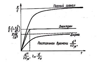 Рис. 3.11. Схема движения электронно-дырочной пары в детекторе с р-n-переходом и обратным смещением Будем считать, что напряженность электрического поля линейно растет вдоль оси х внутри области существования объемного заряда (см. рис. 3.6). Рассмотрим движение носителей только в области, где существует электрическое поле. Так же, как и при вычислении формы импульса в детекторе с р-i-n -переходом, рассмотрим энергетический баланс, приравнивая работу электрического поля над носителями изменению энергии конденсатора. Однако в р-п- переходе напряженность электрического поля В результате получаем, что полное изменение заряда равно е, как и следовало ожидать. На рис. 3.12 изображена временная зависимость изменения напряжения на р-n -переходе после образования в обедненной области пары электрон – дырка. Видно, что импульс напряжения в таком детекторе имеет более сложную форму, чем в случае р-i-n -перехода, и нелинейно зависит от времени. Однако реально постоянные времени, характеризующие движение дырок, оказываются весьма малыми и практически не ограничивают разрешения детекторов. Временная постоянная, описывающая сбор носителей, зависит только от удельного сопротивления материала в обедненной области. Однако реальное разрешающее время такого детектора часто ограничивается не временем сбора носителей, а другими причинами. Одна из них – наличие собственной постоянной времени детектора RC, появляющейся из-за существования сопротивления вне области перехода (если обедненная область не занимает всего объема детектора) и собственной емкости перехода. Длительность сигнала может увеличиться из-за образования электронно-дырочной плазмы с плотностью, существенно большей плотности основных носителей (до 1018 пар/см3 ), очень тяжелыми заряженными частицами, а также нелинейной зависимостью подвижности носителей от напряженности электрического поля при больших значениях напряженности. Эти эффекты существенны при разрешающих временах порядка наносекунды и меньше. Численно оценить их трудно.