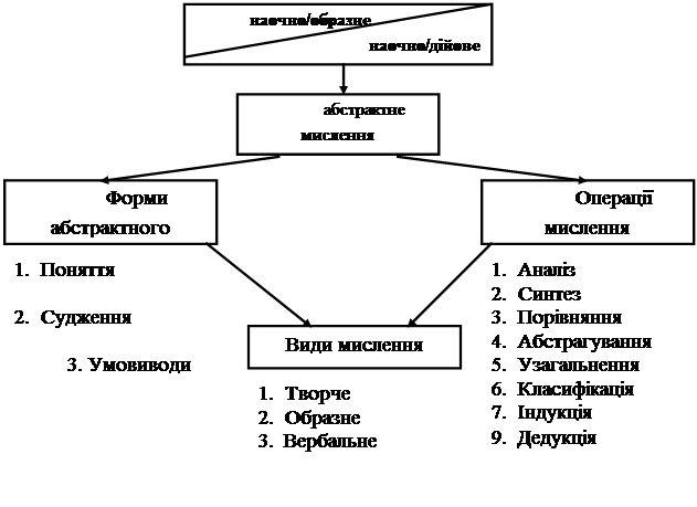 Інша класифікація видів мислення: 1. Наочно-дійове, яке формується у дитини від народження до 3-х років. 2. Наочно-образне, що розвивається з 3 до 7 років. 3. Абстрактне, яке починає активно формуватися з 7 років. Усі види мислення можуть удосконалюватися на підставі цілеспрямованого тренування. Психічні пізнавальні процеси є тісно між собою взаємопов’язаними (Табл. 10).